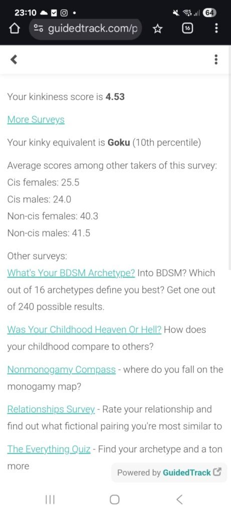 Der Kinki-Score war nicht sehr hoch. Die Art und Anzahl meiner Vorlieben halten sich wohl eher in Grenzen. Aber hier ein witziger Funfact zum Schluss: Mein Kinki-Aquivalent sei wohl der fiktive Charakter Son Goku aus Dragonball (Beweis-Screenshot unten zu sehen).
